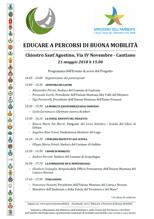 L’evento di avvio del Progetto “Educare a Percorsi di Buona Mobilità” avrà inizio nel pomeriggio del 21 maggio 2018 a partire dalle ore 15, presso il Chiostro Sant’Agostino in via IV novembre a Cantiano.